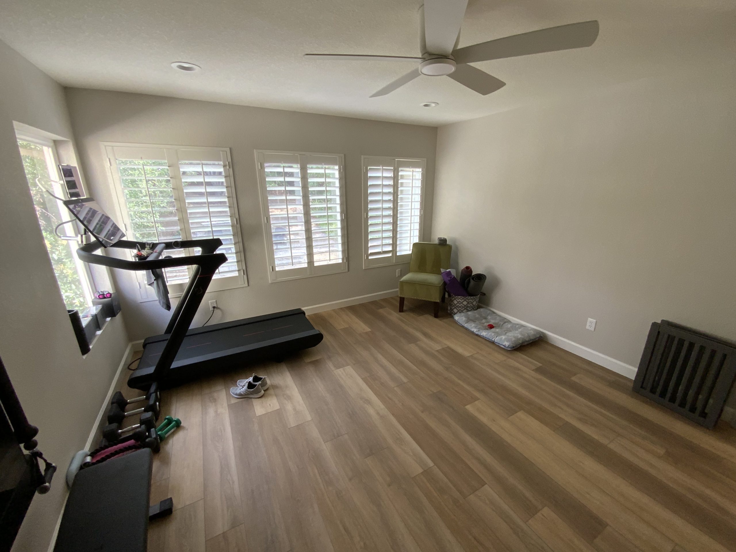 This fun family in Clayton realized their vaulted Family Room was wasted space.  By adding a floor extending from the overlook balcony, it created this perfect workout space.  For the Family Room ceiling below, we created this amazing coffered ceiling.  They were such a fun couple to work with.  I always enjoy bumping into them around town and catching up.