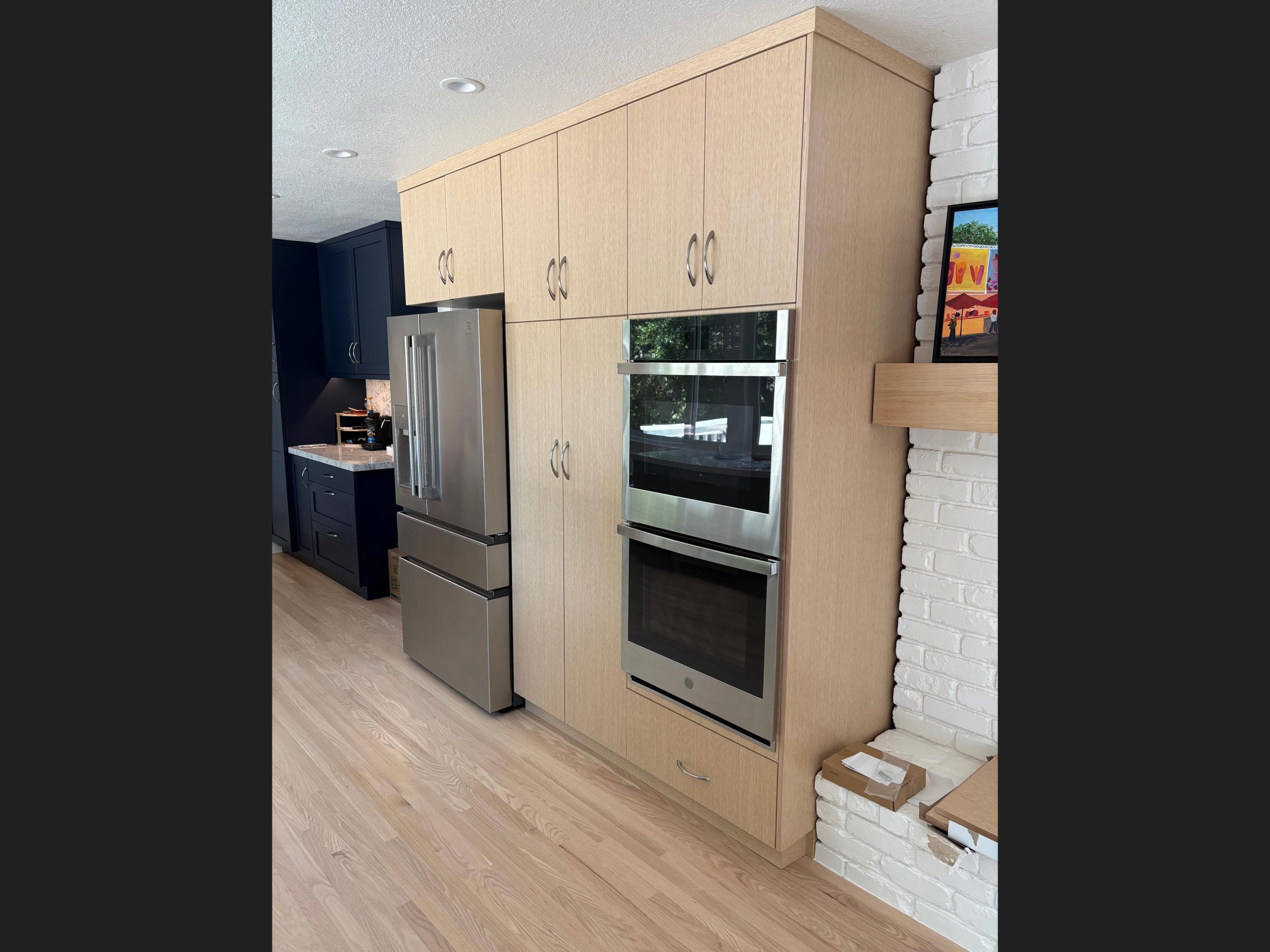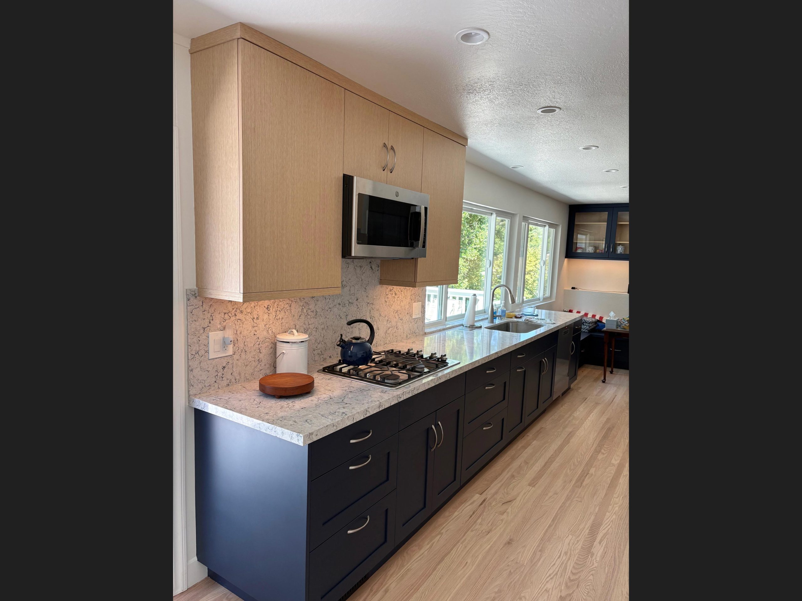 This horseshoe shaped kitchen really felt closed in right in the center of the overall space.  We removed the soffit and upper cabinets to create longer site lines and a much more open feel.  The two tone cabinets really break up the space too.  Now it's light, open, and airy.