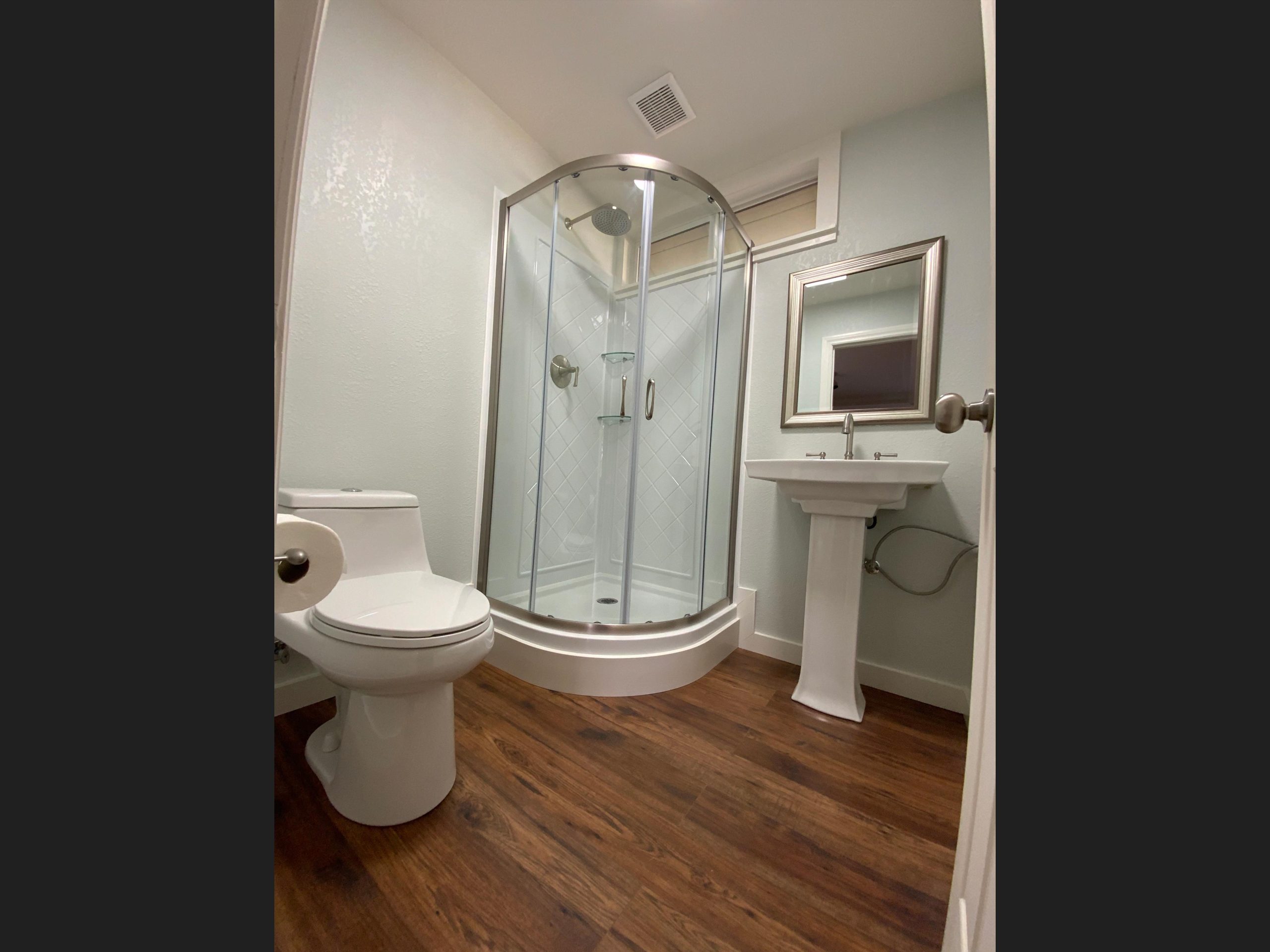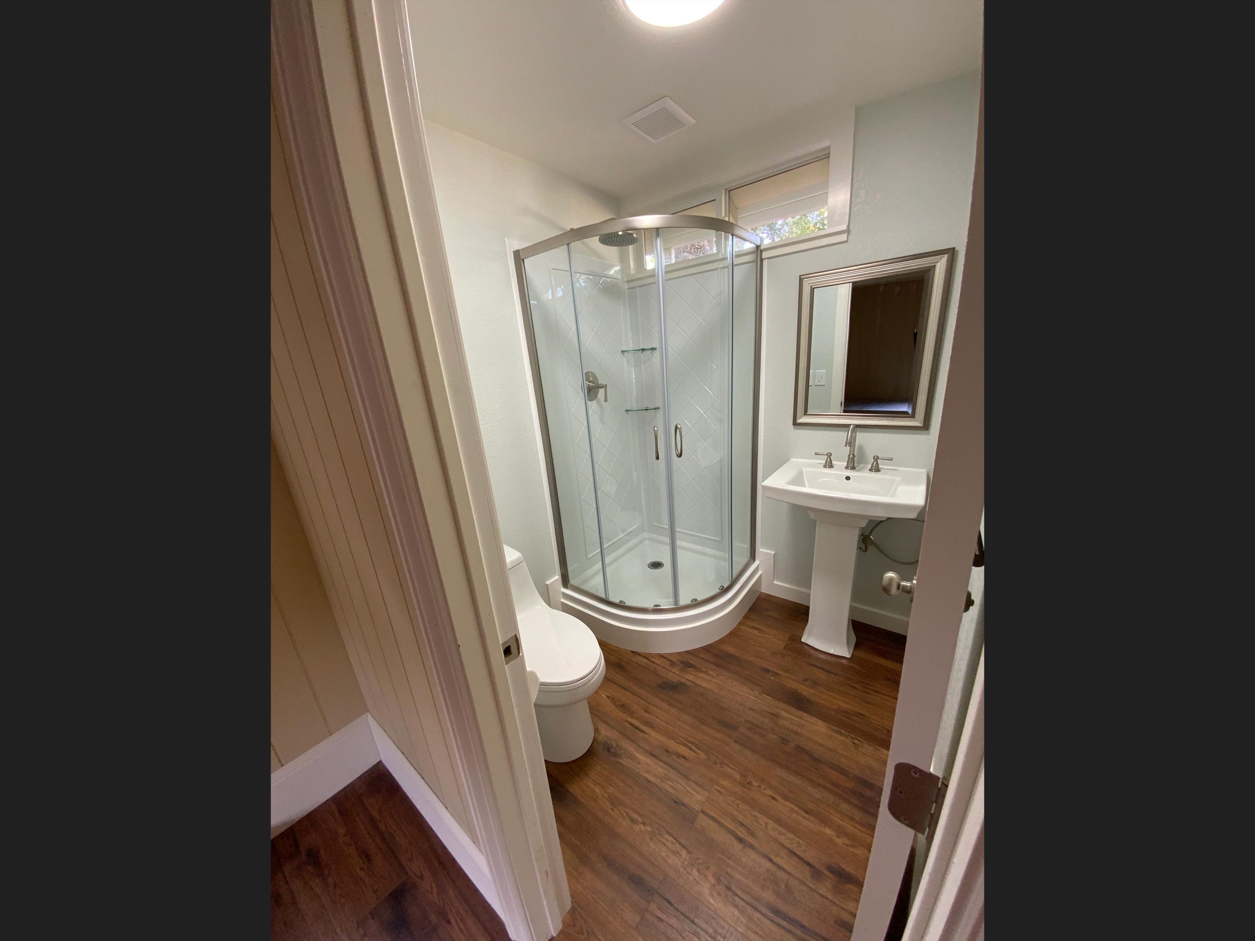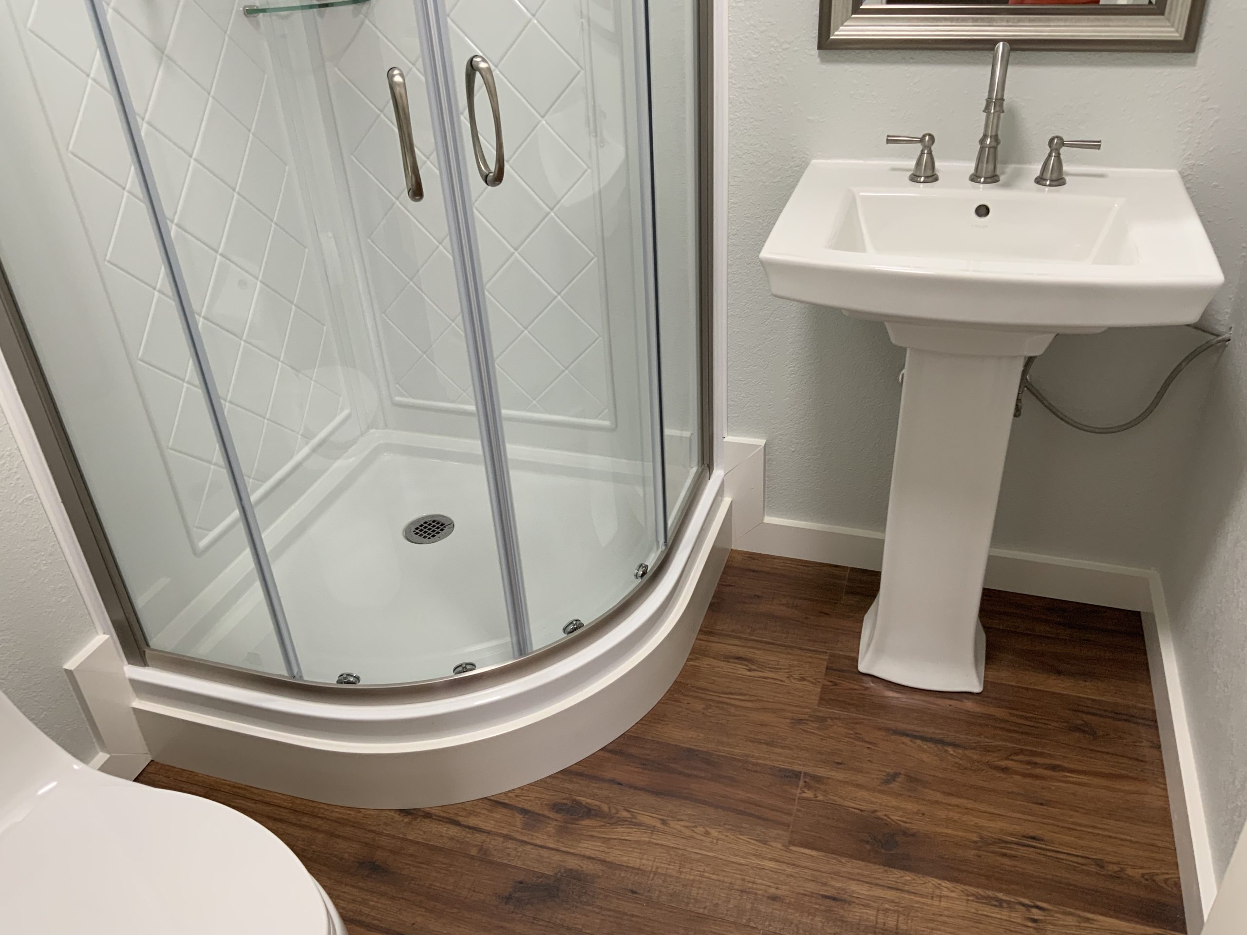 This young family needed a bathroom refresh in their cottage with a baby on the way. Extended family were coming for an extended stay to help with the new family addition. The shower drain was above the slab so the floor needed to be built up matching the curved pan edge.